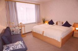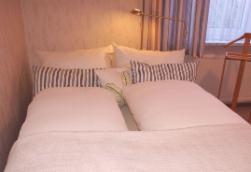 Schlafzimmer mit Doppelbett (Liegefläche Einzelbett 1 m x 2 m) und Schlafsofa (Liegefläche 1,40 m x 2 m).
